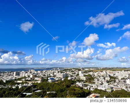 沖縄県宜野湾市の市街地と青空 住宅街と海が広がる都市風景