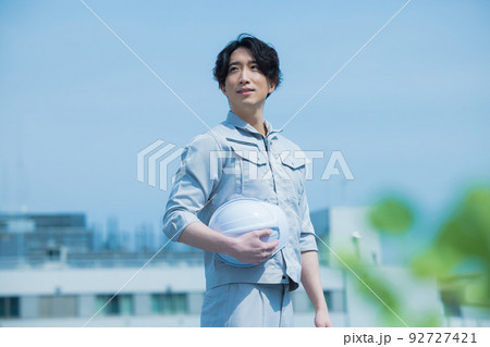 ヘルメットを被った作業服姿の30代の男性 横顔