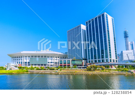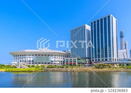 日本の横浜都市景観 みなとみらいのKアリーナと隣接するヒルトン横浜などを望む