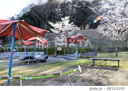 群馬県高崎市 観音山公園のケルナー広場と遊具と満開桜と散策路