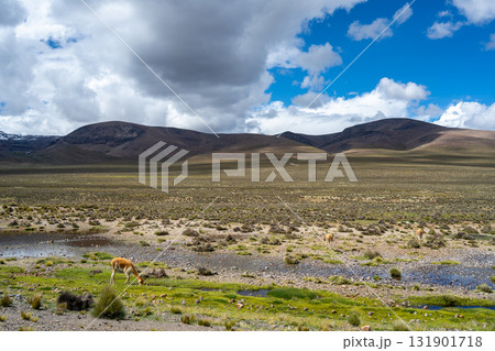 Vicunas Grazing in the Plains of Peru Majestic Mountains