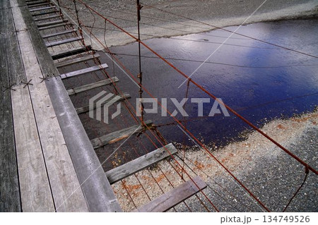 朽ちかけの吊橋をわたる