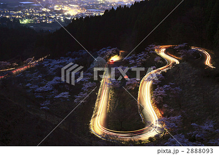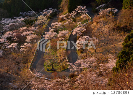 夕暮れ高森峠の千本桜風景「九十九曲がり」と呼ばれ約7000本の桜が3kmの沿道を埋め尽くす景色」