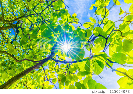 日本の植物風景 太陽光とハクモクレンの新緑。エコロジー、高潔な心、自然への愛などのイメージ…=横浜