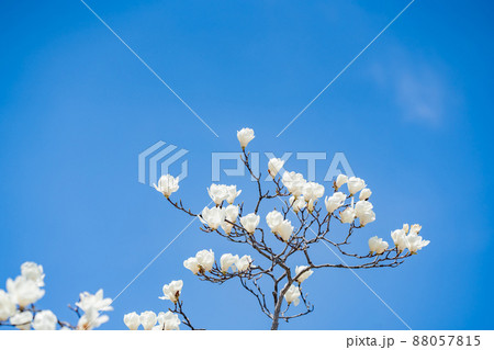 日本の横浜都市景観 太陽光とハクモクレン。エコロジー、高潔な心、自然への愛などのイメージ…=横浜