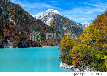 長野県大町市平 鮮やかなミルキーブルーの高瀬ダム調整湖の紅葉と冠雪した山々の景色