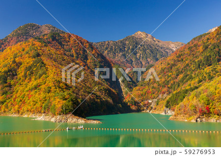 長野県大町市平 鮮やかなミルキーブルーの高瀬ダム調整湖の紅葉と青空に映える冠雪した山々の景色