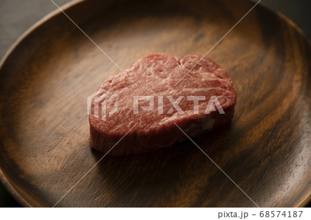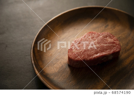アカシアプレートにのせた生の肉厚牛フィレステーキ