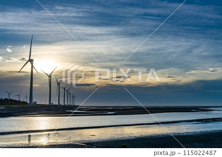 夕方時の高美湿地 夕暮れと風力発電所 台中市 台湾