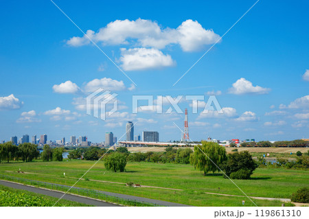 荒川の川原より川口元郷の住宅街を望む 青い空に白い雲