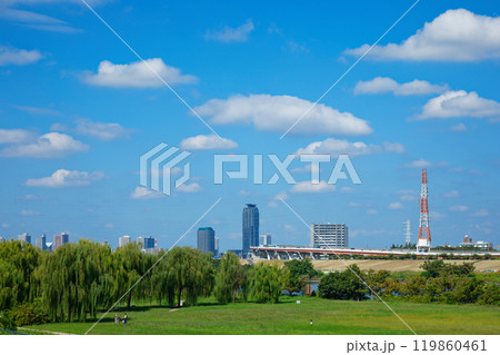 荒川の河川敷グラウンドと青い空に白い雲 扇大橋と日暮里舎人ライナー