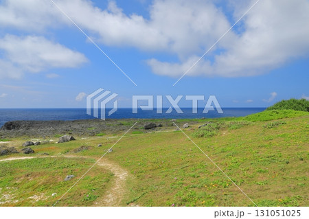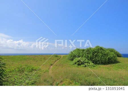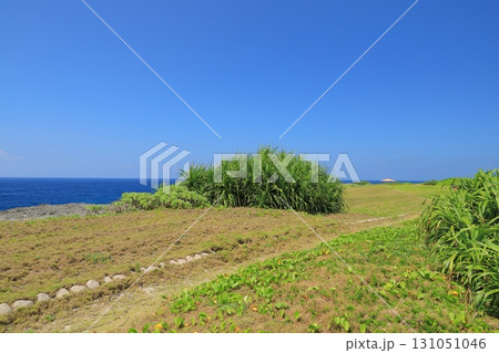 波照間島の日本最南端の広場の水平線を望む草原の風景
