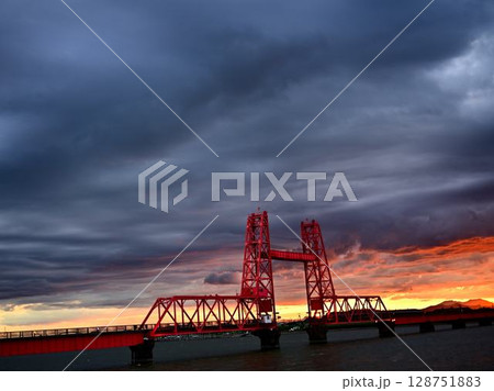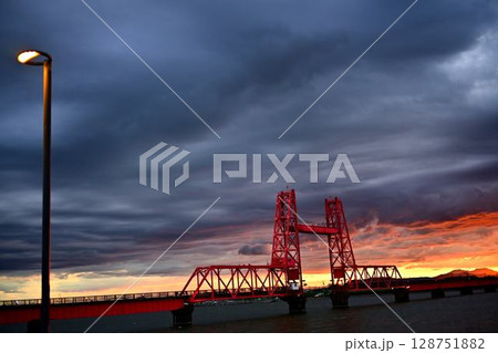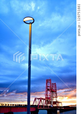夕焼けに染まる昇開橋と空と街灯