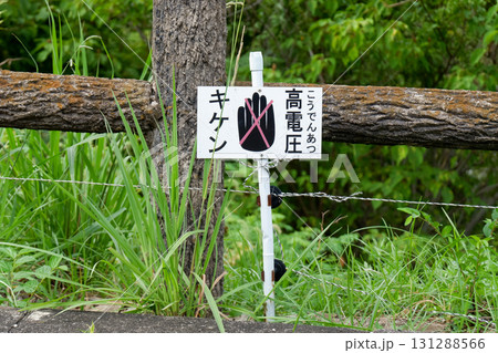高電圧危険!獣害対策の電気柵と警告看板 (High Voltage Danger! Electric