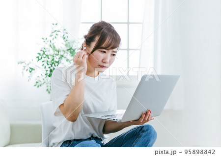 イヤホンを使いながらパソコンを使って困る日本人女性(音楽・動画)