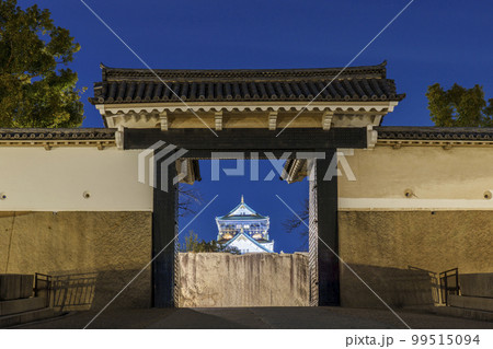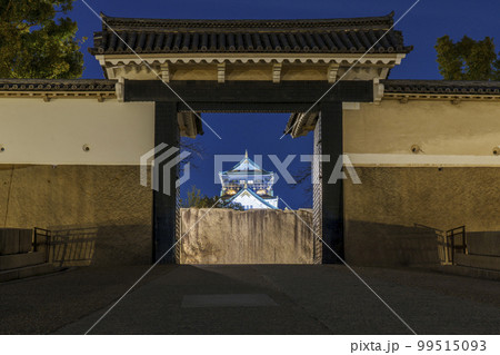大阪城桜門 門の中央に大阪城天守閣が見える 夜景