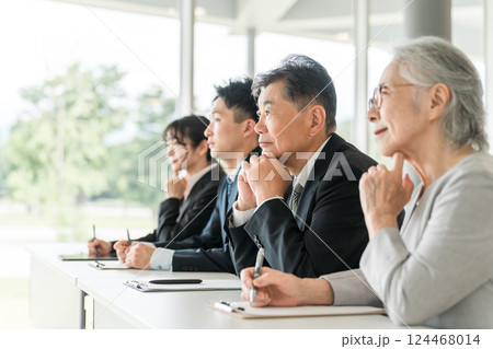 セミナーを受けるスーツ姿のシニアと若者(自己啓発・家族セミナー・介護セミナー)
