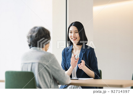 若い男性職員にスマホの操作を教わるシニア女性 撮影協力「LINK FOREST]