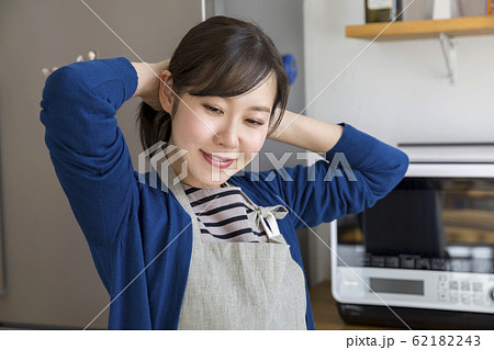 髪をまとめる女性 エプロン 準備 ポニーテール 4:3