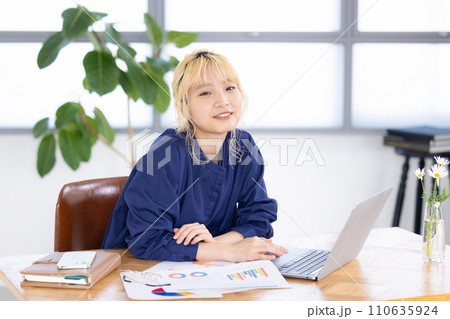 おしゃれなデスクで快適なテレワークをする女性(ネイル、ピアス、髪型自由)イラスト