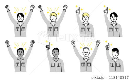 採用のイメージ、髪色・ひげ自由・外国人・シニア、作業服の男女のイラスト、ベクター