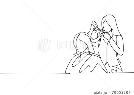 Single one line drawing pretty brunette working as hairdresser and cutting hair tips of female customer in beauty salon. Hair style concept. Continuous line draw design graphic vector illustration