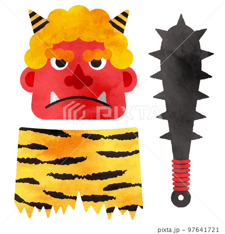 水彩タッチの赤鬼の面・パンツ・金棒のイラストセット