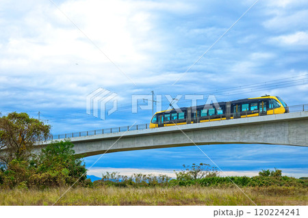宇都宮市 朝日を浴びて鬼怒川を渡るLRT(次世代型路面電車)