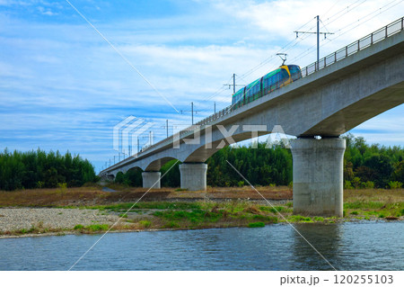 東武鬼怒川線「中岩橋梁を渡る特急リバティと河川敷風景」