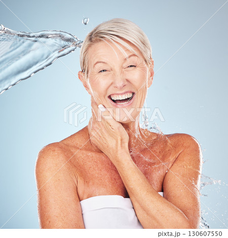 Smile, shower and portrait of a woman with a water splash isolated on a blue background in studio. Grooming, hygiene and face of an excited senior model with body and self care on a backdrop