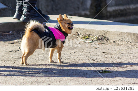 A beautiful Chihuahua dog in a beautiful jumpsuit walks outside