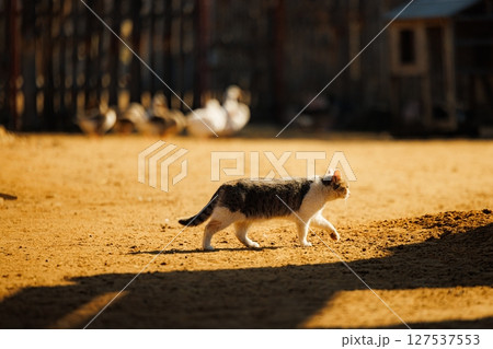 Cat wanders through a sunlit farmyard among ducks in warm afternoon glow