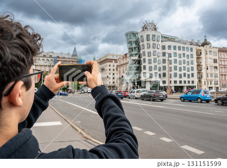 Prague, Czech Republic, August 7, 2023. A young Caucasian man photographs with his cell phone the fascinating three quarter view of the Dancing House: futuristic shapes and modern materials.