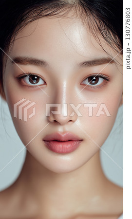 Korean woman with radiant skin and striking features poses beautifully for a close-up portrait in a neutral setting