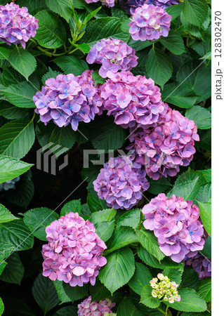 初夏に咲く下田公園のピンク色のアジサイの花のクローズアップ
