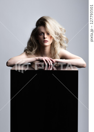 Beautiful woman with big wavy hair and black cube studio portrait