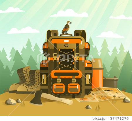 Camping cards set illustration. Cartoon hiking outdoor elements. Feel the vibes. Get ready. Start