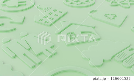 Green technology concept, symbols related to technology and nature arranged in a random, minimal style.