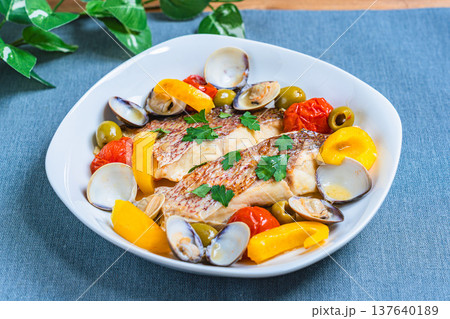 真鯛のアクアパッツァ、あさりと野菜を使ったイタリア料理