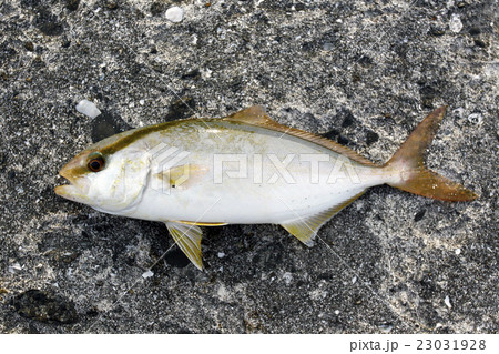 カンパチの若魚を釣って、浜の玉石の上に寝かせて撮った