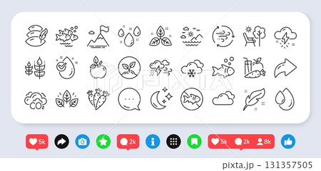 Snow weather, Sea mountains and Cloudy weather line icons pack. Social media: share, comment, like icons. Moon, Water drop, Fish school web icon. Mountain flag, Gluten free, Pillow pictogram. Vector