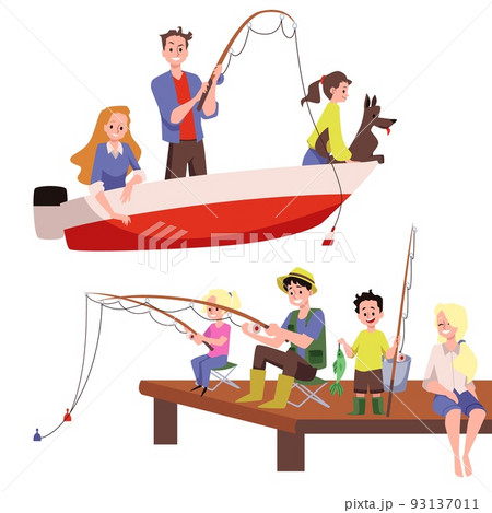 Family fishing from boat and bridge set of flat vector illustrations isolated.