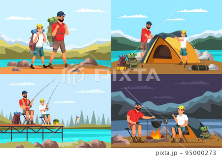 Set of family travelling, active vacation and hiking. Father and son with backpacks go to mountains, fishing, camping, cooking in camp bowler at stake and spend time together. Vector illustrations