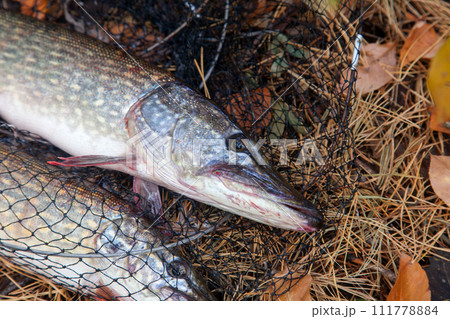 Freshwater pike fish. Big freshwater pike fish lies on keep net with fishery catch in it..