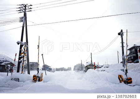 新潟県魚沼市の町並み 只見線 魚沼田中駅の踏切 冬晴れの青空 田舎の散歩