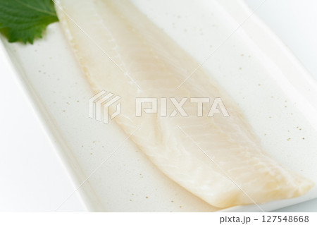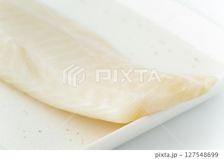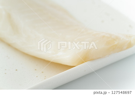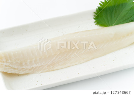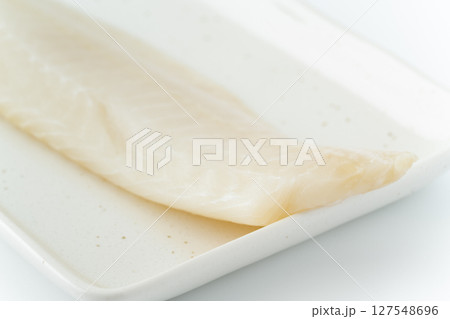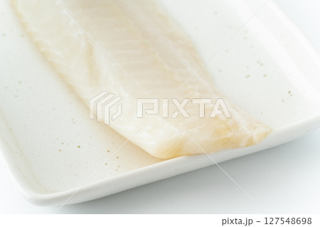 白背景に角皿に載せたサメガレイの柵
