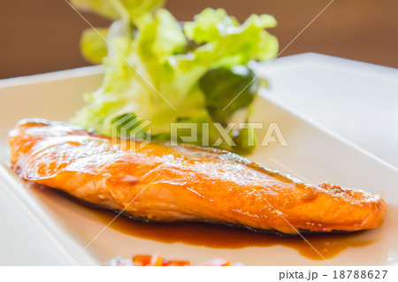 Grilled salmon steak with Japanese sweet sauce on a plate.
