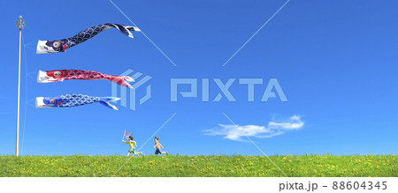 鯉のぼりが気持ちよく泳ぐ土手沿いの道を走る元気な子ども / こどもの日・端午の節句・爽やかな休日