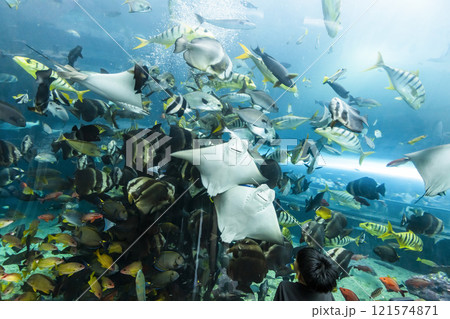 View of the fish at the Underwater Tunnel at the National Museum of Marine Biology and Aquarium in Kenting National Park of Pingtung, Taiwan.