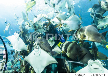 View of the fishes at the Underwater Tunnel at the National Museum of Marine Biology and Aquarium in Kenting National Park of Pingtung, Taiwan.